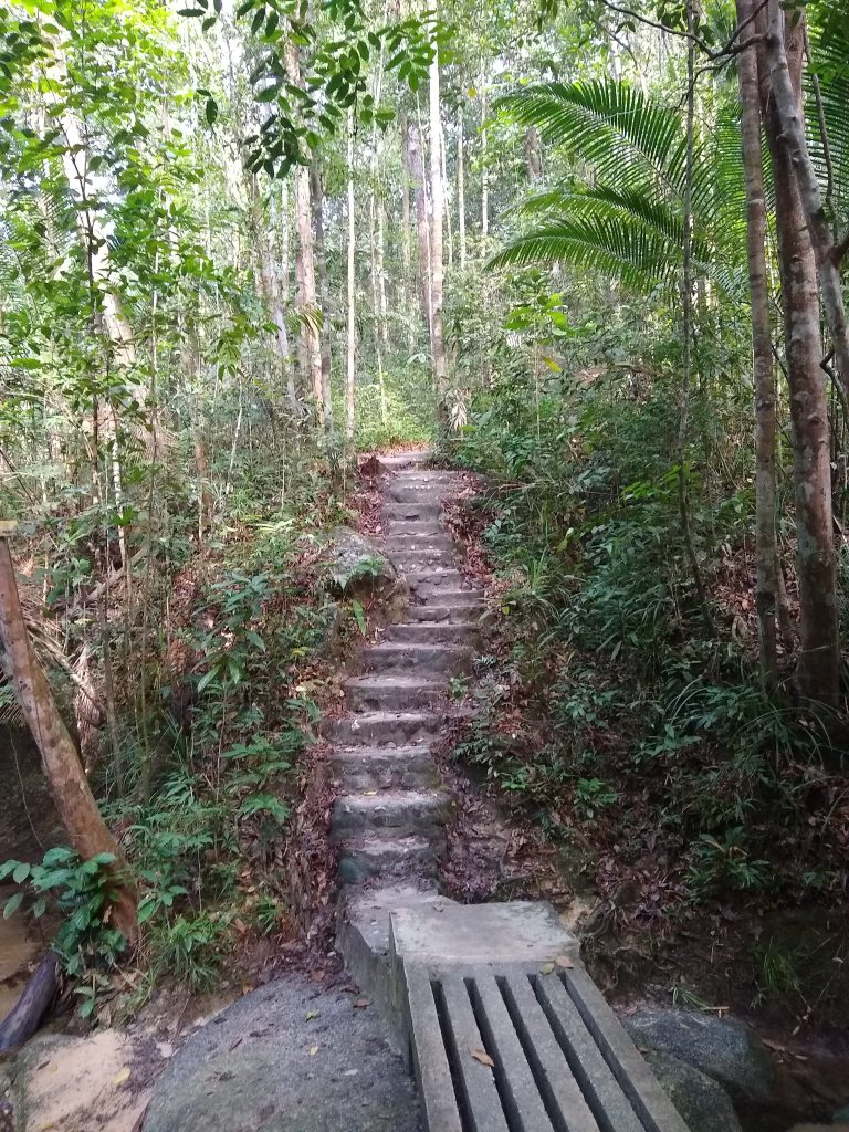 Last Friday we had aggressive plans for lots of activities in Langkawi. The first of which was the 7 wells waterfall area. That started with 50o-some steps up to the 7 ponds (wells, I guess) that feed the waterfall (which is below that). No problem, but then we saw a trailhead that went all the way up to 7 wells peak. Being the adventures we are -we started tackling it, Tevas and all. Two hours later, we were nearly at the top, in the clouds, storm coming, and having to use pre-placed ropes to get up to the peak. We got to only about 250 feet away from the peak, but retreated due to conditions. Even if we made it to the top, there was only the inside of a cloud to view! I call it an adventure – but we both kinda broke ourselves getting up and down. Sara with back pain, me with a very tight ankle. On top of that, the world taught us about leeches. Yes leeches. Yuk. Next time we’ll wear proper shoes and socks. Maybe even leech socks.